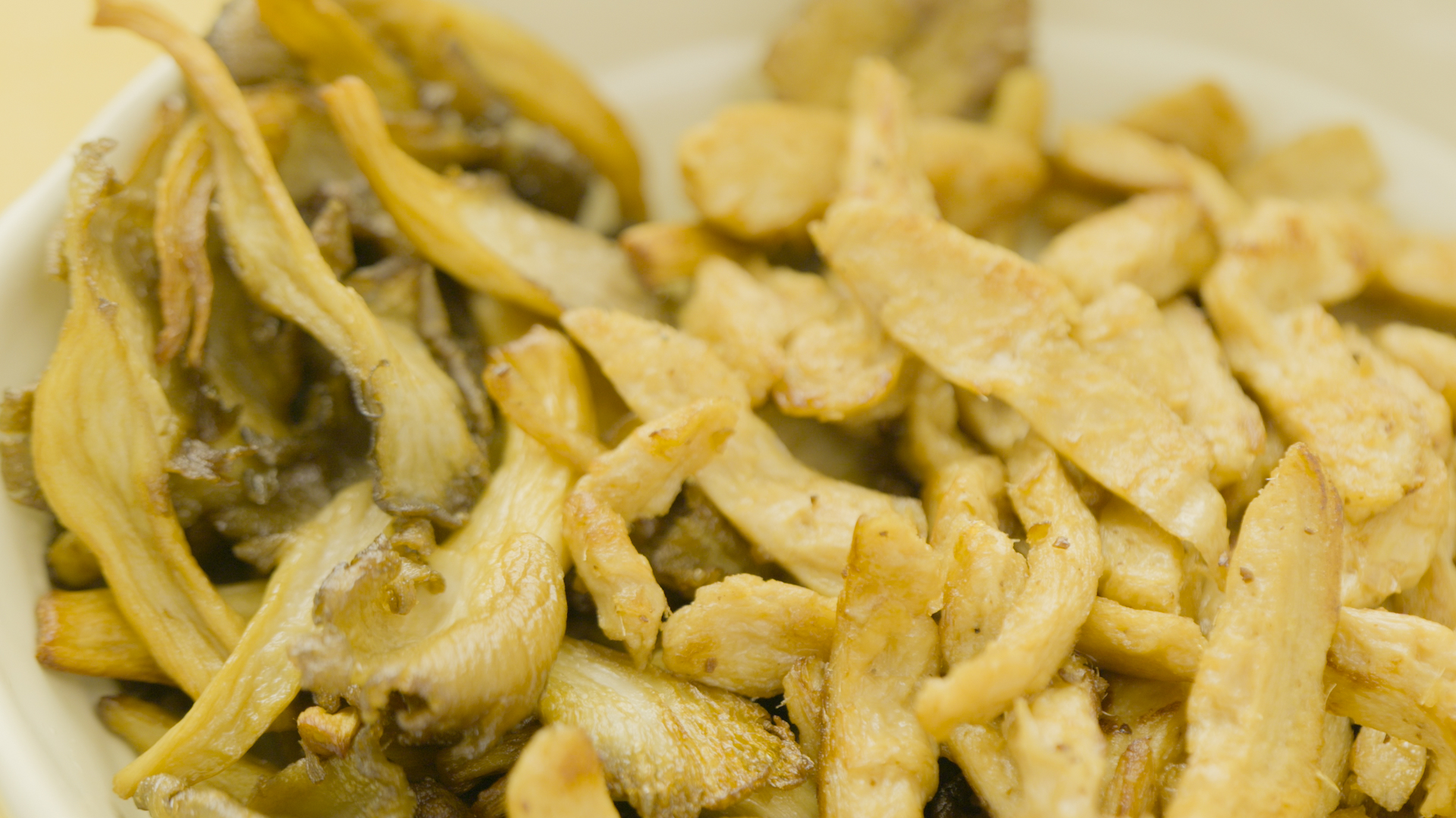 Hình 2. Gà xé thuần chay và nấm bào ngư chiên giòn
