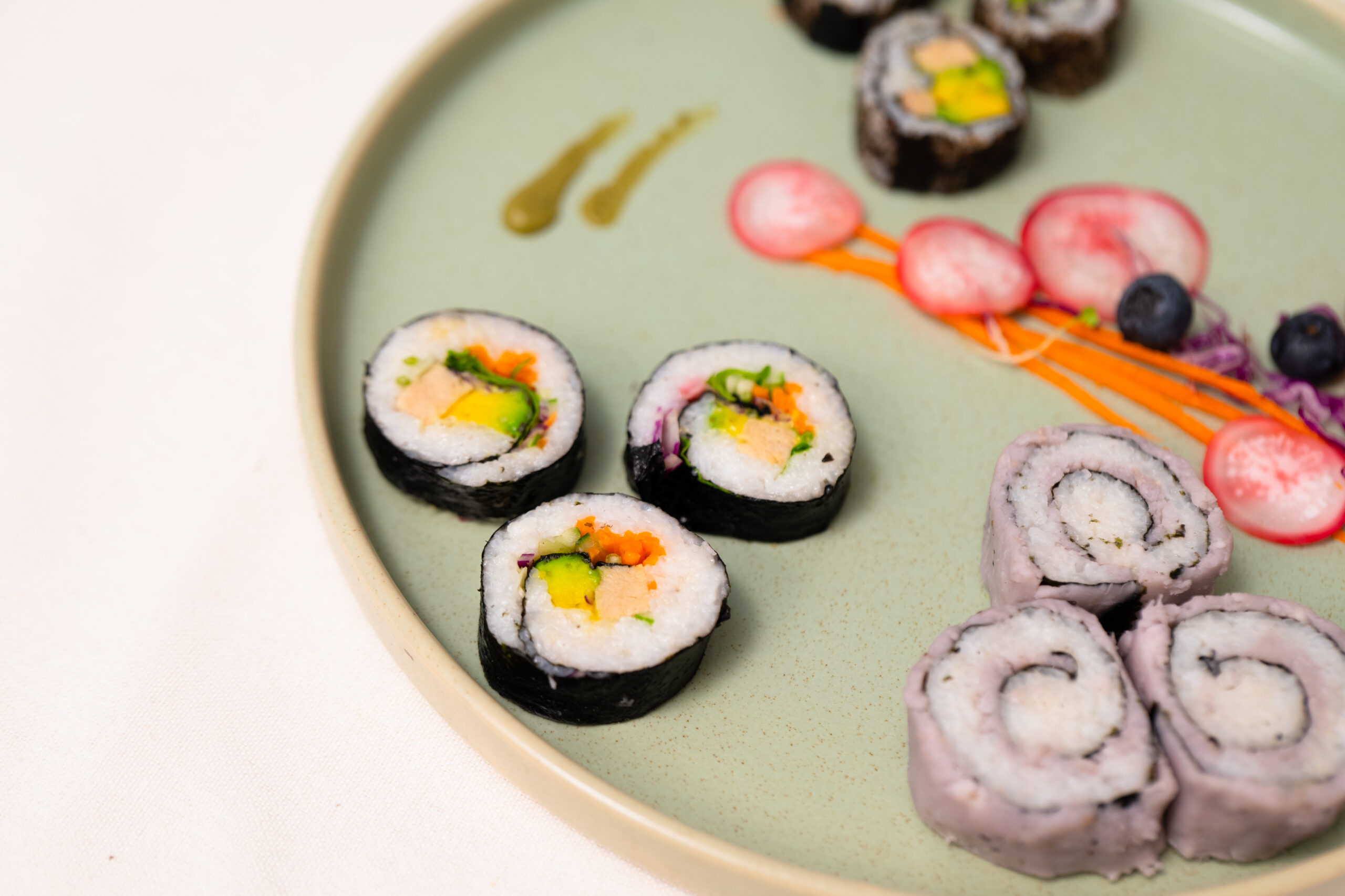 Với kimbap mè đen, vẫn là trải cơm ra rồi rắc mè đen lên, mặt còn lại cho topping bơ, gà chay vào nhé.