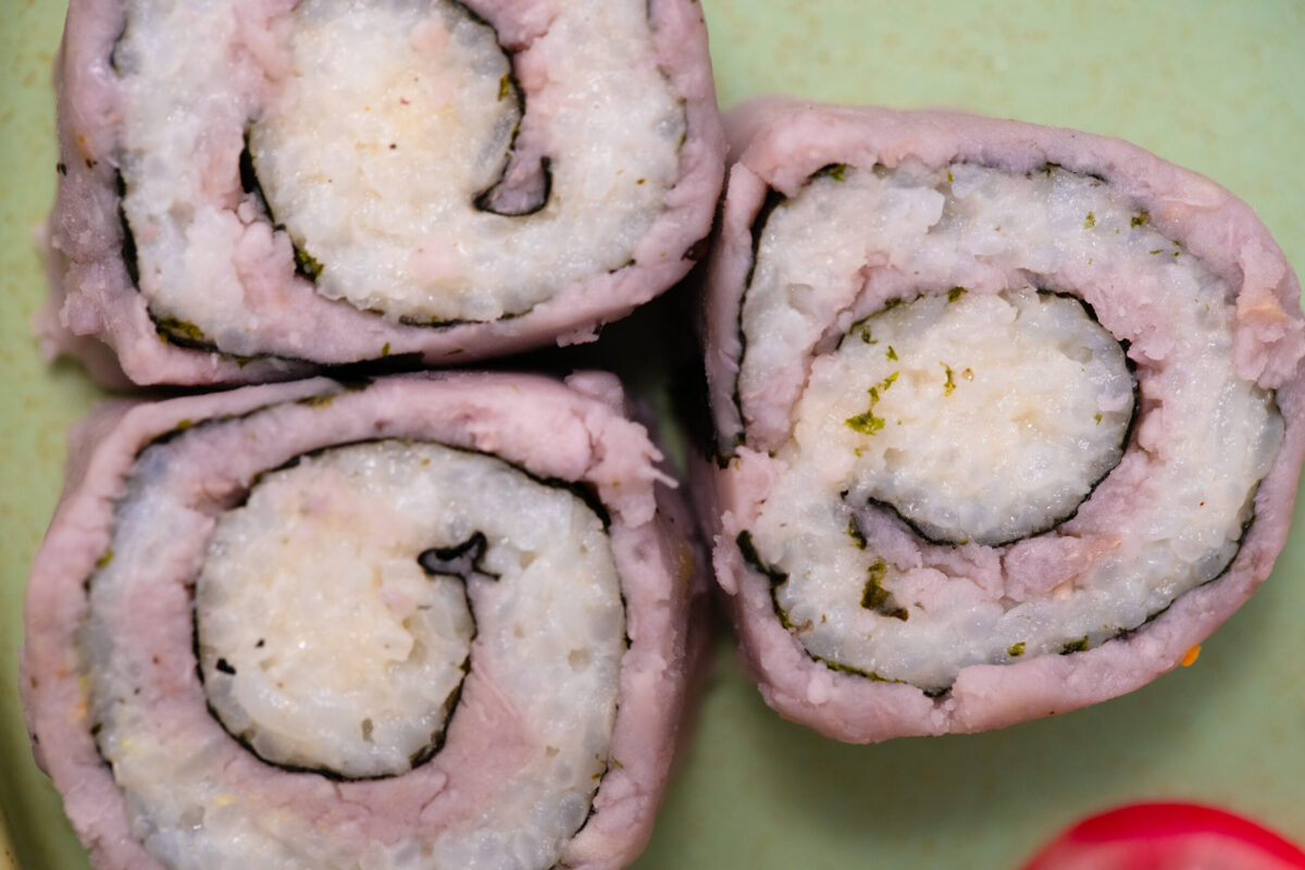 Tiếp theo là kimbap khoai môn, cách làm thì tương tự như kimbap truyền thống nhé nhưng mọi người sẽ trải đều bằng khoai môn đã nghiền, sau đó lật lá rong biển lại và dàn đều mặt cơm. Món này trông thế thôi, nhưng làm lẹ lắm.